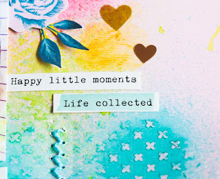 First of all, I used a stencil and texture paint (gel mediun) to create patterns and after it had dried, I sprayed and painted over the patterns. I love how the medium resists the ink. Next I zig-zag stitched randomly in the lower half of the layout with colorful thread that matches the ink. I fussy cut some flowers and decorated them around the photo. For embellishments, I used stickers, word diecuts and chipboard for the title. I didn't use many products, but I love how it turned out. Here are some details;