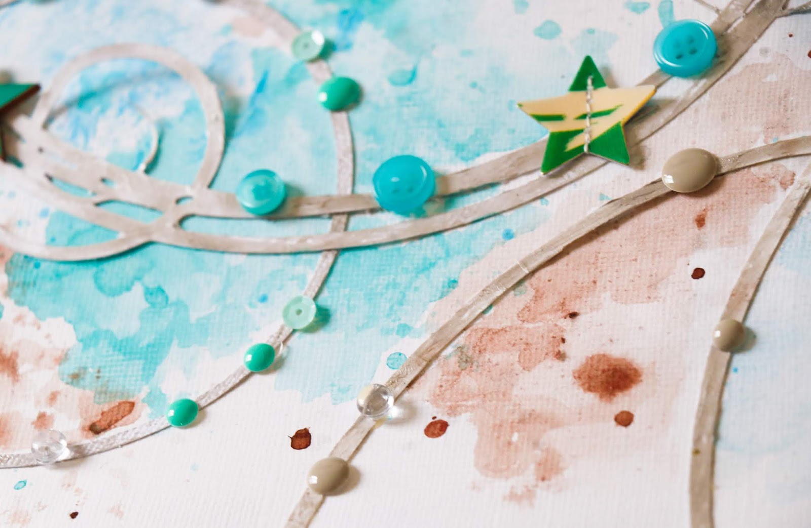I started with a cut file. I painted it with textured paint, let it dry and cut it into several parts. Before adhering them down, I painted and splattered some watercolors on the background. I cut the picture round so it will match the circles of the cut file and placed it inside it. I decorated around the circles with enamel dots, buttons, dew drops, wooden stars and stickers. Here are the details;