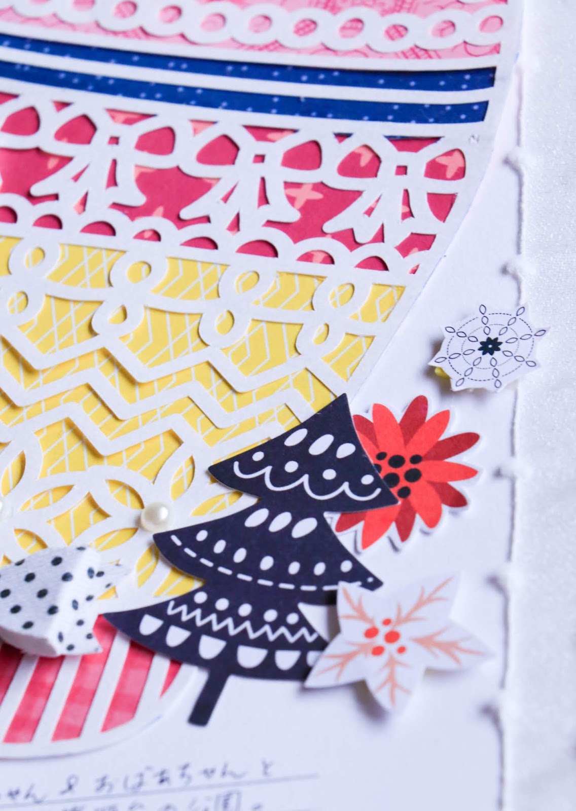 まずPaige Evans のカットファイルを選んでカットしていたのですが、途中で紙がずれて枠がくちゃくちゃに。捨てるのは勿体ないので、中の英字をテンプレートにしてペーパーをカット。次に英字の淵を手でステッチ。英字の裏にフォームを貼って立体感を出しました。クシャっと丸めて広げたヴェラムを写真に重ねて貼り、英字をチップボードやダイカット、カットアウトしたお花で飾り付けて完成。クローズアップです。